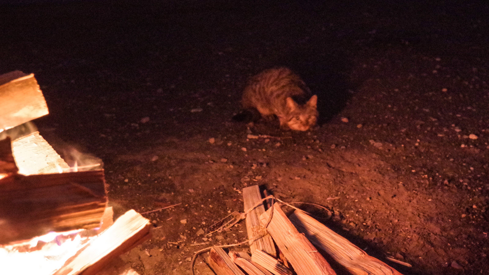 食べ物の匂いに釣られたのか、焚火の熱に吸い寄せられたのか分かりませんが一匹現れて暫くこちらを見た後どこかに行ってしまいました